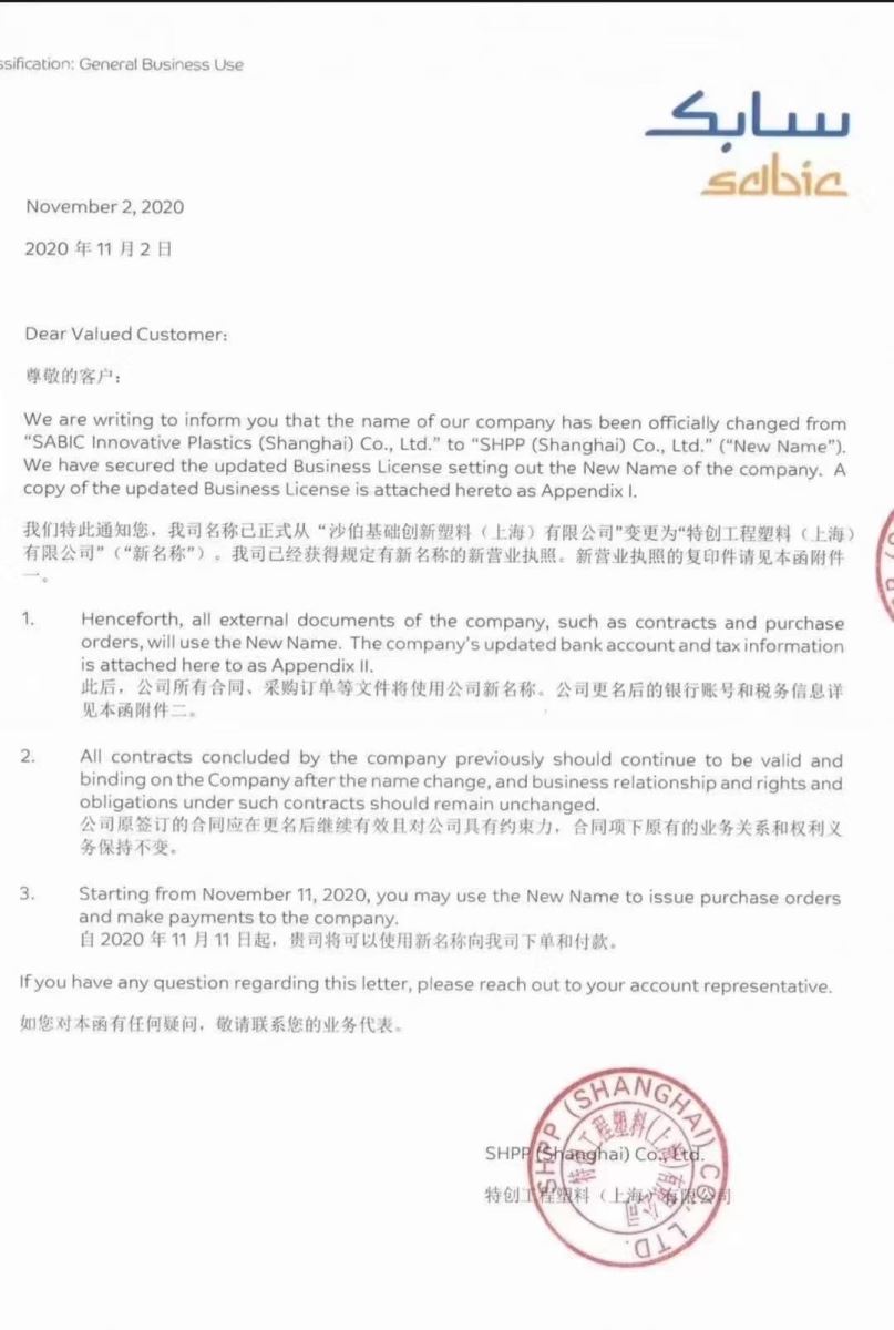 我們特此通知您,我司名稱已正式從“沙伯基礎創(chuàng)新塑料(上海)有限公司"變更為"特創(chuàng)工程塑料(上海)有限公司”(“新名稱”),我司已經(jīng)獲得規(guī)定有新名稱的新營業(yè)執(zhí)照。新營業(yè)執(zhí)照的復印件請見本函附件一。